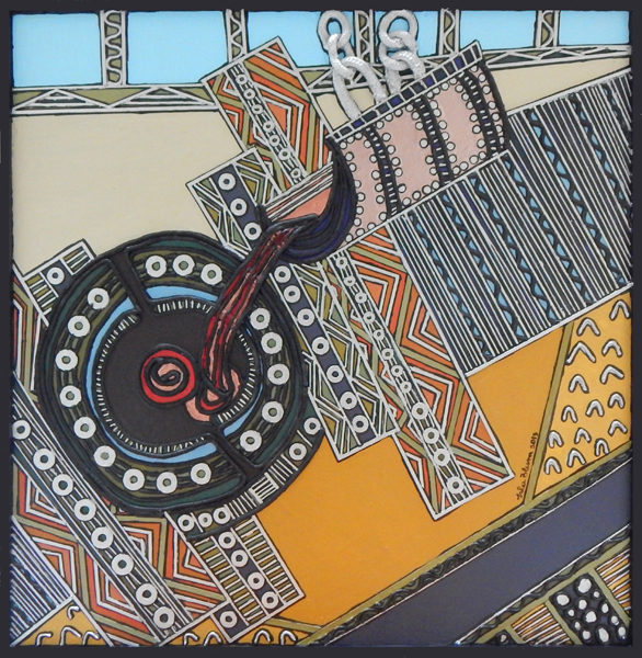 LA COLADA CONTÍNUA DE LA FÁBRICA DE ACERO Collage s/madera 1,00 x 1,03 m 2015 Serie Mujeres y Varones del Acero, Serie Somisa, San Nicolás